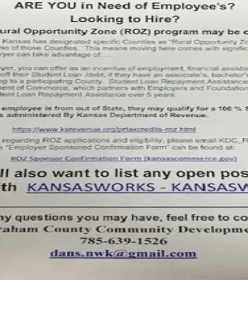The Graham Co. Workforce Development Committee established the WORKFORCE BOARD, which has Grant funds available for Businesses to provide Hire-On Bonus funds for those "hard to fill" and necessary Positions.